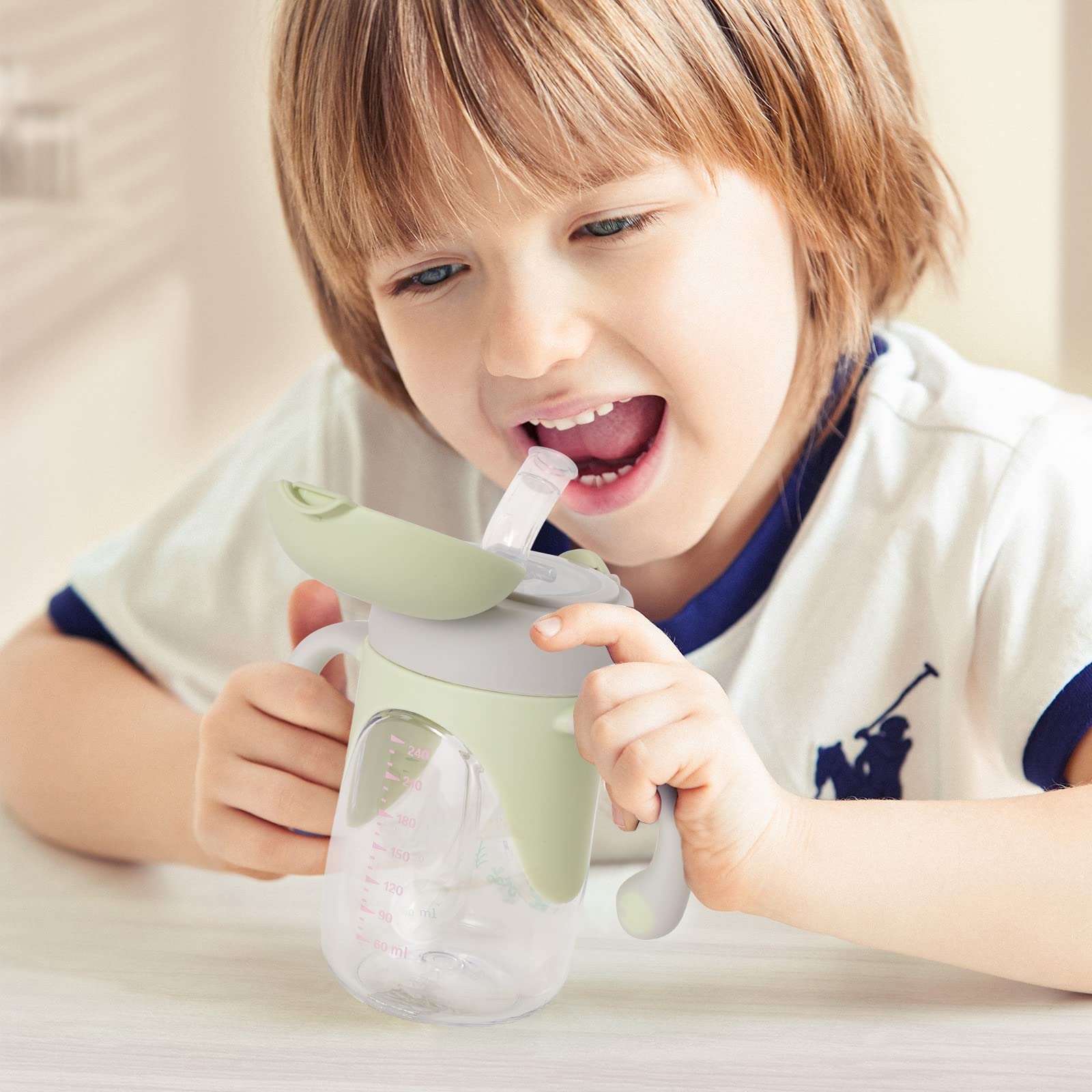【シンプルでかわいいデザイン】 両手でしっかりと持つことができる取っ手付きで、ストローは引っ張っても抜けない構造になっているので好奇心旺盛な赤ちゃんにピッタリです。また、分解・組み立てが簡単ですぐに取り外せて洗うのも簡単です。やわらかいシリコンゴム製のストローなので喉突き事故の心配もありません。ボトルに30ml~240mlの目盛りが付いているので飲んだ量が一目で分かります。